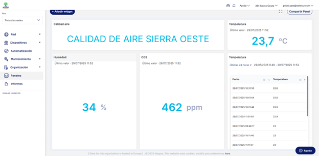 De la mano de nuestro partner Nespra, los datos generados por los sensores se visualizan en su plataforma cloud, permitiendo una visualización clara a través de dashboards intuitivos. Gracias a la capacidad de personalización de la plataforma, Sierra Oeste puede adaptar sus panales a sus necesidades específicas.